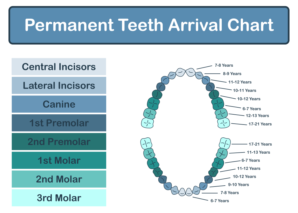 Permanent teeth will begin to erupt at about five or six years of age. Some permanent teeth will replace the position of baby teeth and others, such as the molars, will grow in position previously unoccupied. This stage of having both primary and permanent teeth is referred to as the “mixed dentition stage” and usually continues till around twelve to fourteen years of age.